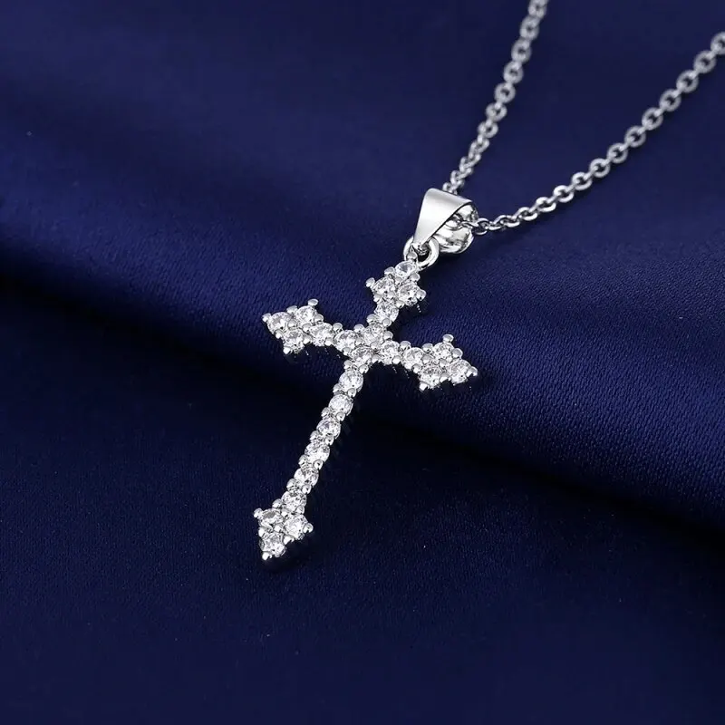 White Gold Color Cross Pendant Necklace with Rhinestones